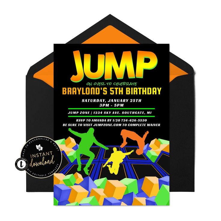 5. Jump into the Fun Invitation: This dynamic invite template captures the excitement and energy of a trampoline party. With bold colors and playful graphics, it’s sure to get your guests excited for the celebration. Add your party details to the template and get ready to jump into the fun!