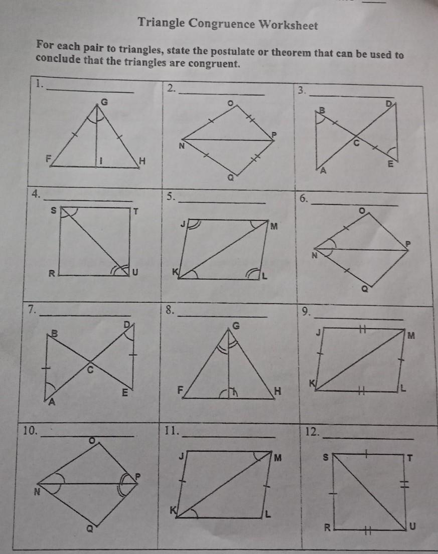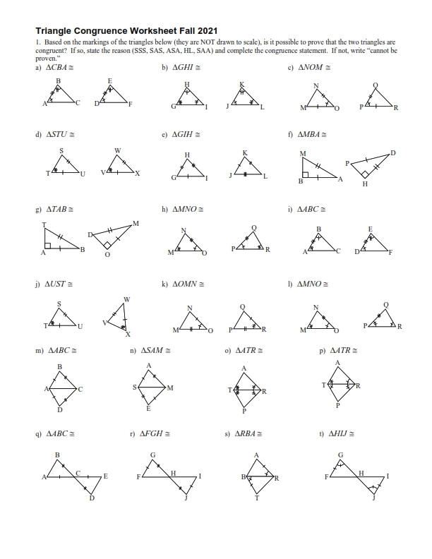 A triangle congruence geometry worksheet is a valuable tool for students to practice and reinforce their knowledge of triangle congruence. These worksheets typically contain a series of problems that require students to determine if two triangles are congruent and to provide a valid reason for their conclusion. By working through these worksheets, students can sharpen their skills and solidify their understanding of triangle congruence.