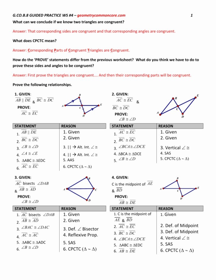 By completing triangle congruence proofs worksheets, students can reinforce their knowledge of the various postulates and theorems that govern triangle congruence. These worksheets typically include a series of problems that require students to identify the given information, state the postulate or theorem that can be applied, and provide a logical argument to prove that the triangles are congruent.