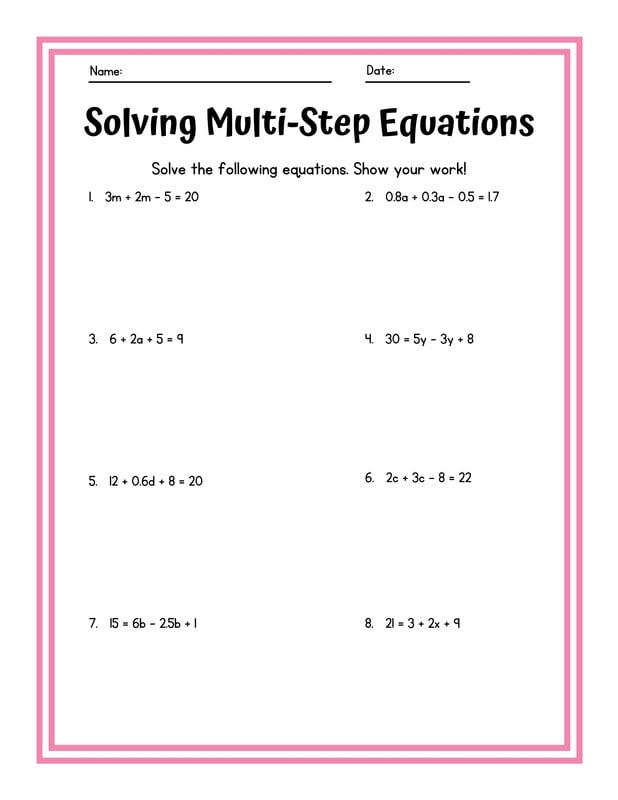 A typical two-step equation worksheet will consist of a series of equations that require two operations to solve. Students will need to perform addition, subtraction, multiplication, or division to isolate the variable and find its value. These worksheets can vary in difficulty, with some featuring simpler equations for beginners and others more complex equations for advanced learners.