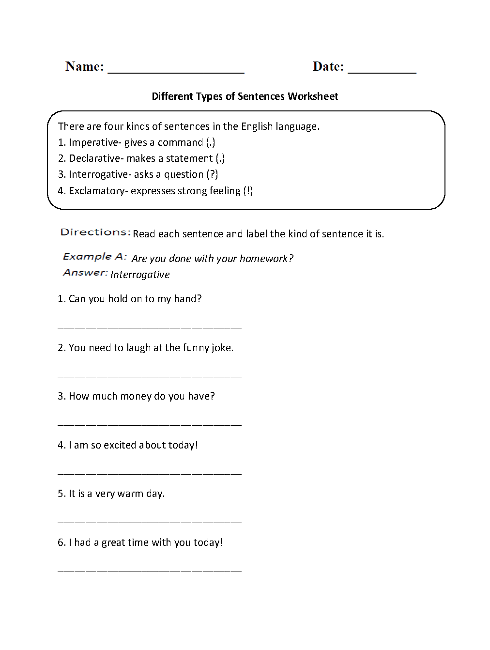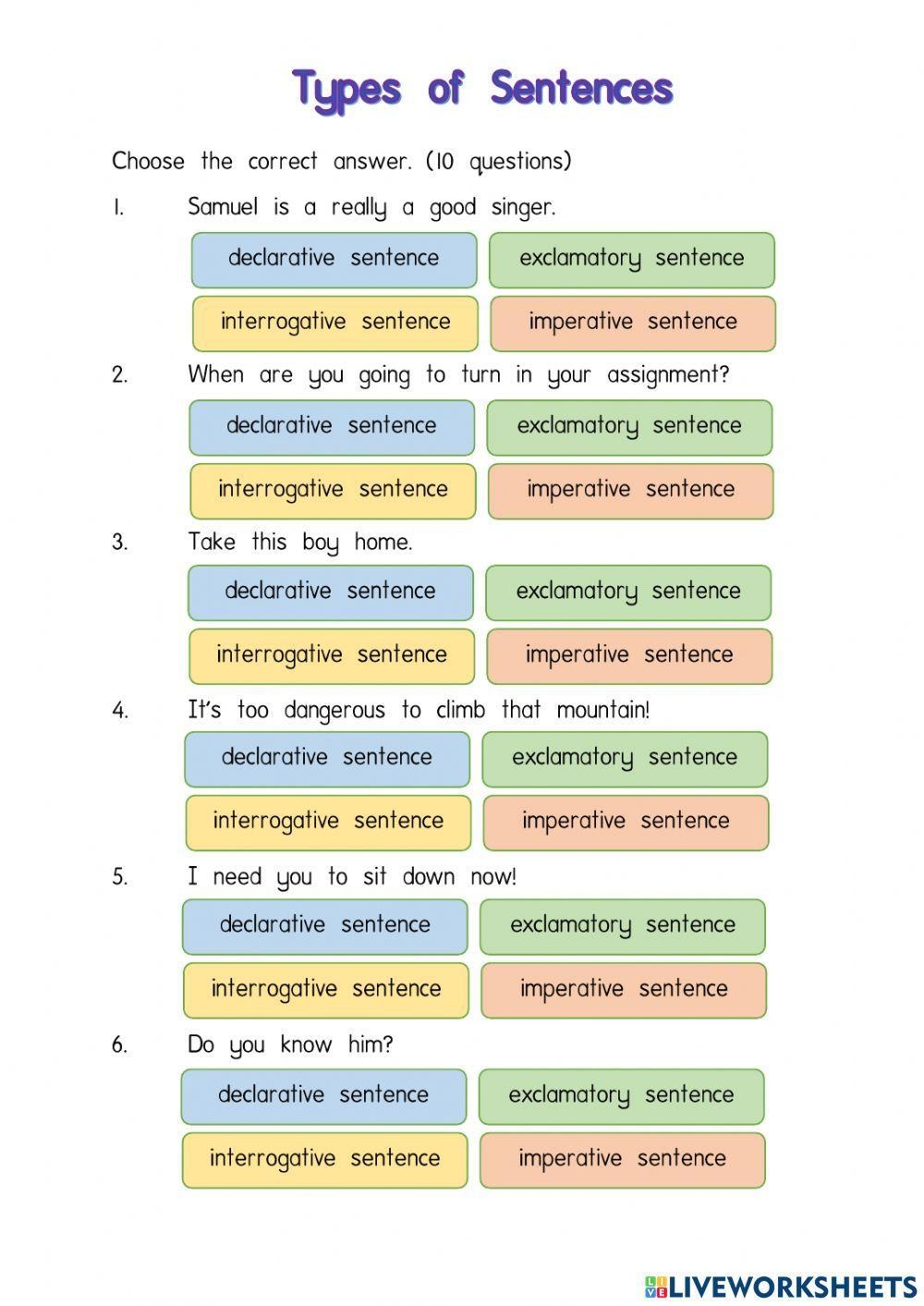 Whether you are teaching grammar in a classroom setting or looking for extra practice for your students at home, a types of sentences worksheet can be a useful resource. These worksheets typically include exercises where students are asked to identify whether a sentence is declarative, interrogative, imperative, or exclamatory.