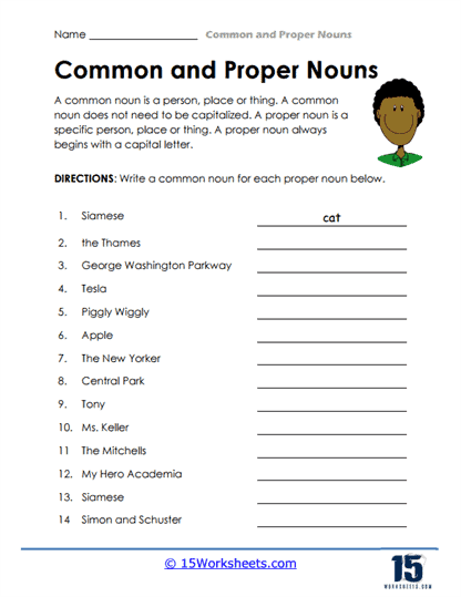 In this worksheet, students would need to identify “dog,” “cat,” “tree,” “sun,” “sky,” “books,” and “backyard” as common nouns, while “London,” “Uncle,” “Museum of Modern Art,” and “New York City” are proper nouns.